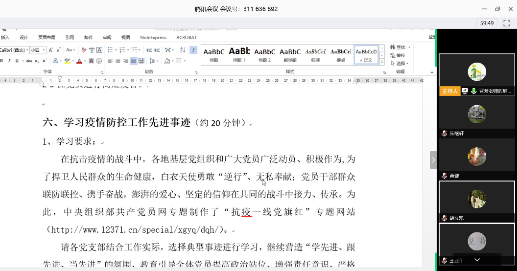 首先,全体党员重温了入党誓词,因为网络延时原因而显得不同步,但全体党员声音洪亮,满怀打赢疫情防控阻击战的强烈信心。然后支部讨论了学习贯彻习近平总书记关于新冠肺炎疫情防控系列重要讲话活动的自学心得。吴敏院长表示,越是艰难的时候,越能体现共产党员的本色,越能体现领导干部的能力,越能体现党员干部的担当,我们要结合当前疫情防控工作的具体情况,认真领会有关精神,使之贯彻落实到我们学院的疫情防控工作和教学科研工作中,扎扎实实完成疫情防控工作和教学科研任务。陈鑫老师表示,对比国外的疫情防控出现的多种问题,国内疫情的较好控制体现了党的领导力和人民群众的积极配合,工作的全局性和调整的迅速,也展现了我们作为负责任大国的国际担当,在疫情防控中,党员同志的先锋模范带头作用也得到了充分的体现,每个人都是责任人的思想让我们每位教职工做好本职工作,做好自己的职责和担当。董凯锋老师表示,这次疫情从最开始的爆发到目前得到有效的控制,都体现了我党英明的决策,果敢的执行力,以及把为人民服务的意识始终贯彻到实处的魅力,充分体现了我党的优越性。葛健老师讲到,国内疫情防控工作成效明显,通过和国外学习老师的交流和反馈来的感受,更能体会到国内党和政府的防控优势,全国一盘棋,积极防控。王亚午老师讲到,以习近平同志为核心的党中央把人民群众生命安全和身体健康放在第一位,迅速做出一系列重大决策,作为一名党员,需要进一步增强“四个意识”、坚定“四个自信”、做到“两个维护”,坚决贯彻落实习近平总书记重要讲话和一系列重要指示精神,牢记人民利益高于一切,紧密结合岗位职责,从自身做起,以实际行动践行听党话、跟党走的初心使命,体现“三个表率”的使命担当。其他老师或发言或将以文字的形式,阐明了自己的学习心得。