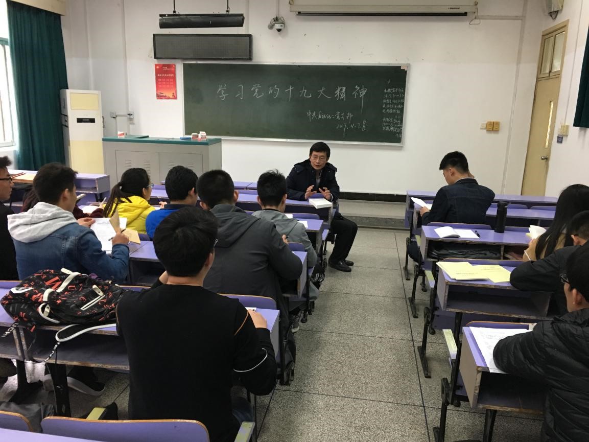 教授、副院长曹卫华来为同学们讲解十九大,带领大家深度剖析十九大其中的某些点。首先,赵超超同志介绍了本次会议的主要内容和相关流程,带领大家齐唱国歌并重温入党誓词。随后曹卫华教授结合个人经历,形象的为大家讲解了十九大主题,概括为以下两点:不忘初心,第一是不能忘记党的初心,为人民谋幸福,为民族某复兴,再者要不忘自己的初心,不忘自身的梦想,努力奋斗,实现自身价值。之后曹卫华教授又组织同学回答了什么是不忘初心,初心是什么,党支部成员以及各个入党积极分子都谈了自己关于不忘初心的看法和理解。最后曹院长举了正反面教材为例,警示同学们要强大自己的内心,坚定自己的信念,不忘自己的初心,不动摇不偏离方向。