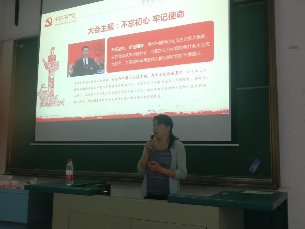 分党校第八期入党积极分子培训班党课第七讲在教三楼208举行。本次党课的主题是“学习贯彻党的十九大精神”,主讲人是机电学院党委书记王海花老师。
