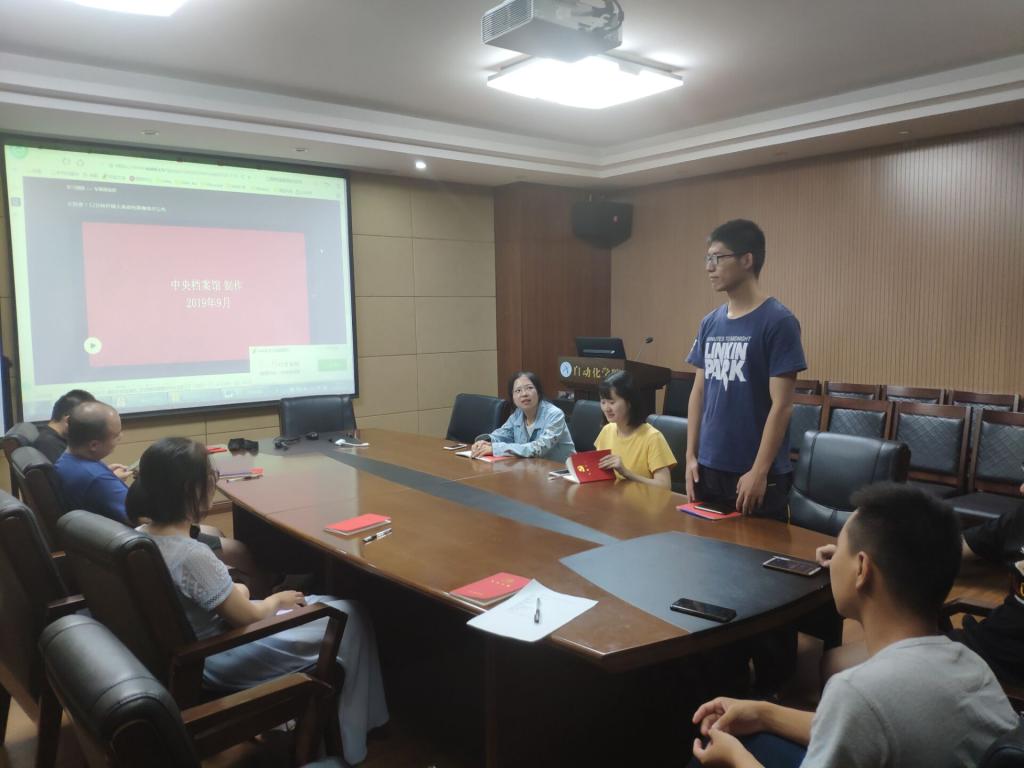 首先,王婕同志介绍了本学期“不忘初心,、牢记使命”主题教育的工作计划以及本次会议的主要内容和相关流程并带领大家唱国歌、宣读入党誓词。随后,王婕同志带领党支部学习《习近平关于“不忘初心、牢记使命”论述摘编》,重点学习第一章节部分:中国共产党人的初心和使命,就是为中国人民谋幸福,为中华民族谋复兴;然后,党支部全体党员以及入党积极分子认真学唱了歌曲《我和我的祖国》,并观赏了《开国大典》、《我们走在大路上》片段。
