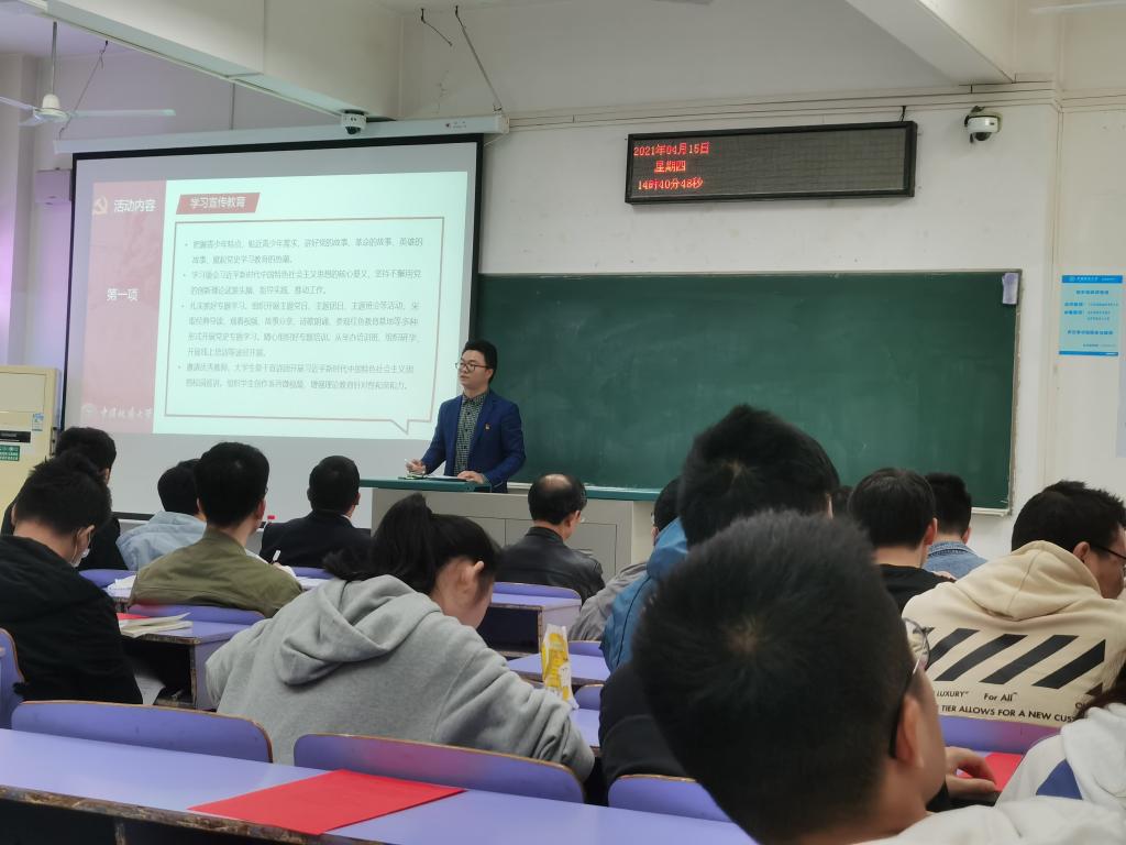 随后,党委副书记何建新就如何推进党史学习教育作了讲话。他谈到,今年是中国共产党成立100周年,在学院组织开展庆祝建党100周年和党史学习教育活动意义重大。围绕党史学习教育,他深刻阐述了为什么学、学什么、怎么学这三个问题。他指出,党史学习教育要做到统筹安排,坚决杜绝形式主义,青年学生要多为身边师生办实事、办好事,真正做到学史力行。他呼吁青年学生要以党史学习为契机,真正做到学党史、悟思想、办实事,开新局,实现全面发展。