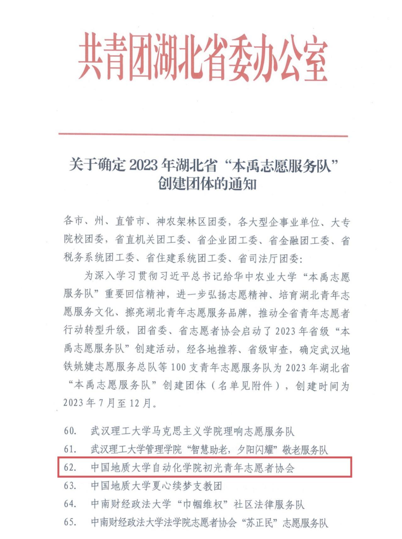 近日,团省委、省志愿者协会印发了2023湖北省“本禹志愿服务队”创建团队(名单),韦德博彩官网