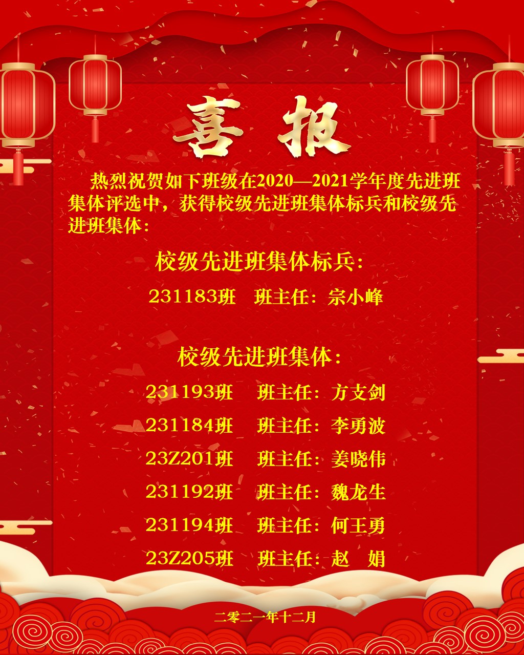 根据《关于做好2020-2021学年度先进班集体(标兵)评选工作的通知》、《关于开展2020-2021学年先进班集体标兵评审答辩工作的通知》,经过学院自评、学校评审,评定先进班集体标兵(综合奖)20个、先进班集体标兵(单项奖)7个、先进班集体104个,韦德博彩官网 以下班级获得校级先进班集体标兵、校级先进班集体:
