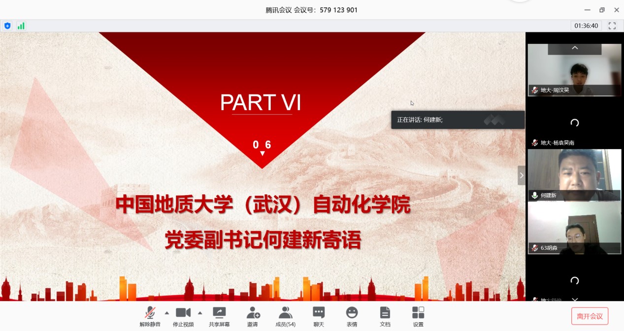 (通讯员:黄兰华 周汶昊)为学习贯彻习近平总书记关于疫情防控工作的系列重要讲话和指示批示精神,认真贯彻落实习近平总书记给北京大学援鄂医疗队全体“90后”党员的回信精神,5月2日晚19:30,中国地质大学(武汉)自动化类专业23Z192班与中国石油大学(华东)地质类1901班“云”端相聚,联合开展以“绽放战疫青春,坚定制度自信”为主题的线上团会。本次团会出席的嘉宾有中国地质大学(武汉)韦德博彩官网