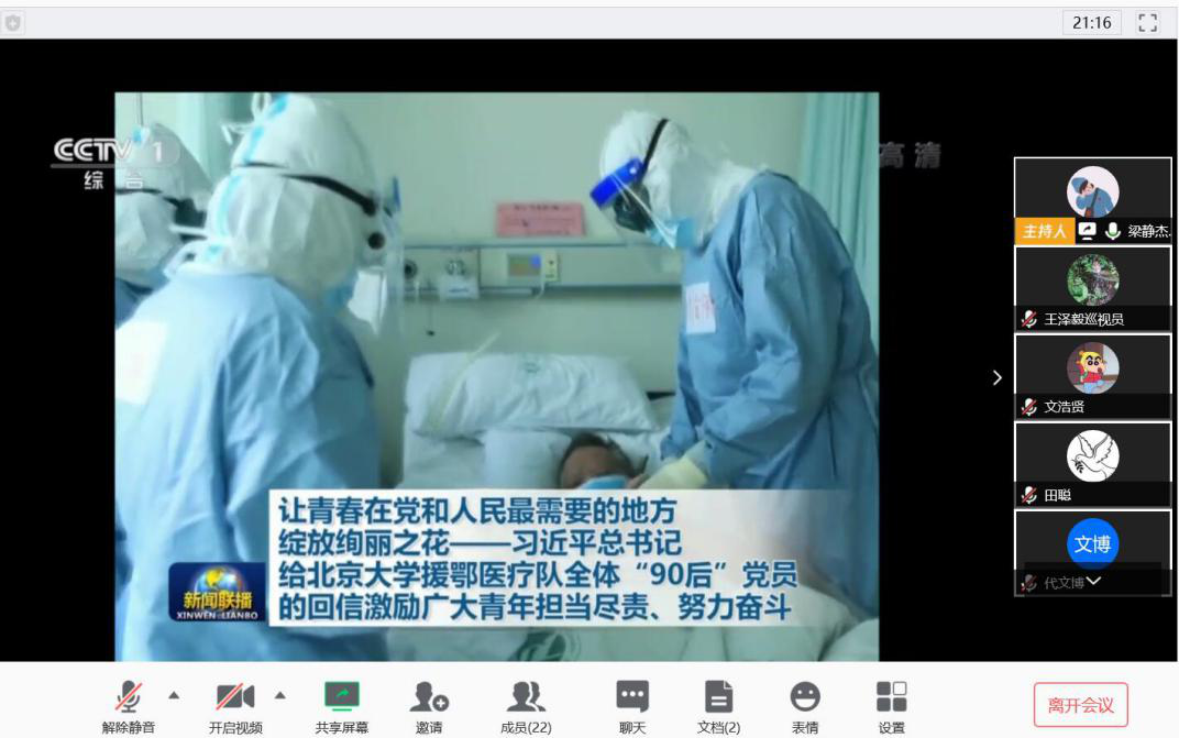 3月24日15:00,232163团支部通过腾讯会议开展召开“学总书记回信,话青春担当”线上主题团日,并邀请许彦老师参加团日活动。会议开始,由团支书介绍此次主题团日的背景、意义。由团支书播放一个关于此次习总书记给全体90后党员回信相关的新闻联播片段,带领大家一同回顾了防控疫情一线90后党员对此次回信的感触,引出了此次团日的主要内容。然后团支书询问同学们对回信精神的理解与认识。团支书紧扣回信精神就国家抗击疫情采取的措施和当代青年人的价值观和责任担当进行研讨交流。同学们自由发言讨论疫情期间的感动瞬间与感动人物,分享自己在疫情期间当志愿者的经历并对祖国未来疫情防控工作的展望表达了积极的展望。最后,由本次的主持人梁静杰进行会议总结,并鼓励同学们保持良好心态、不忘初心、勇敢面对生活中的各项挑战。