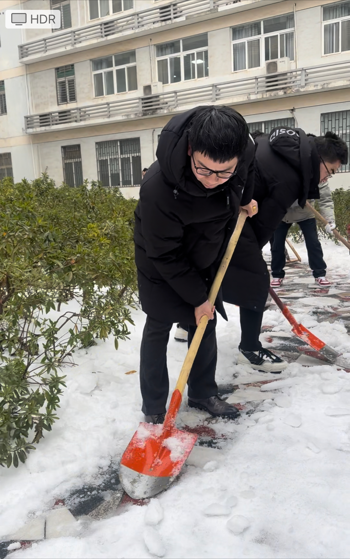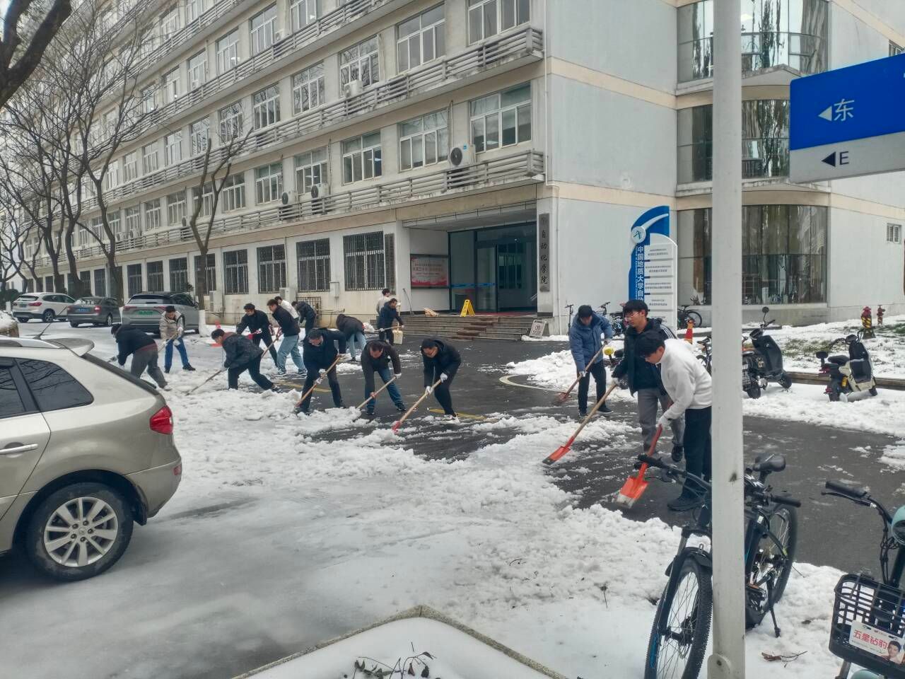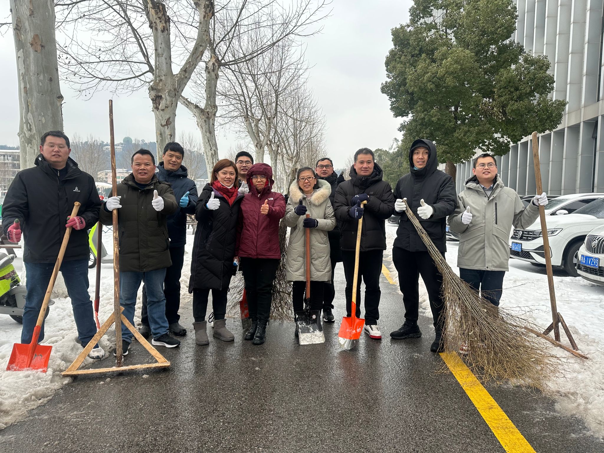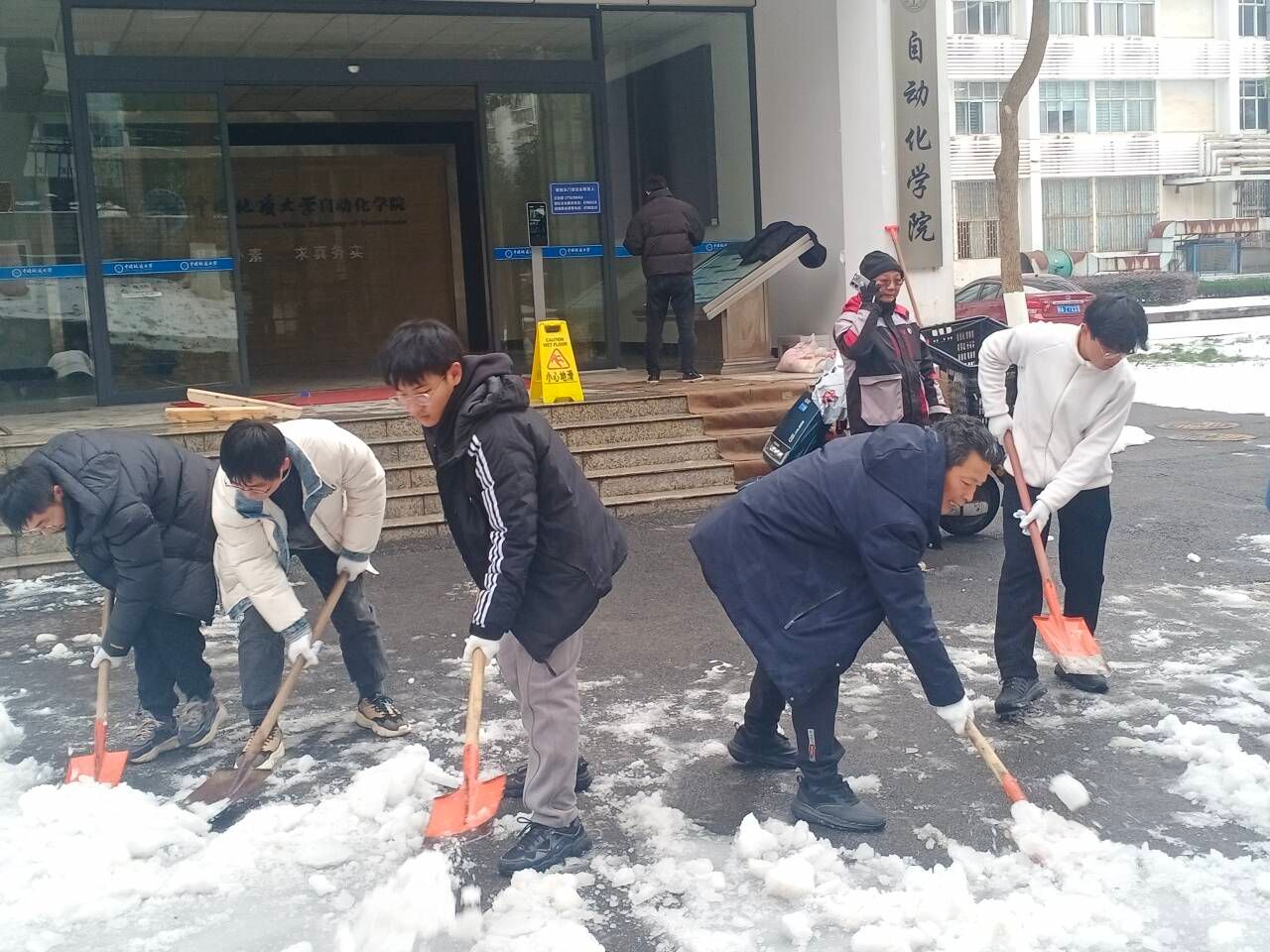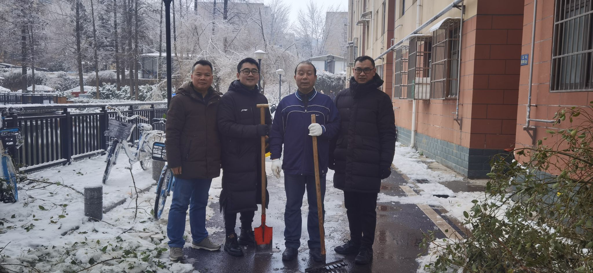 四名教工党员积极响应,参与到扫雪除冰工作中。