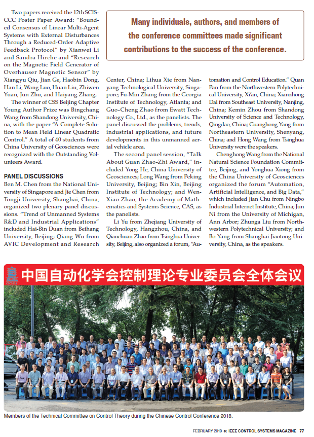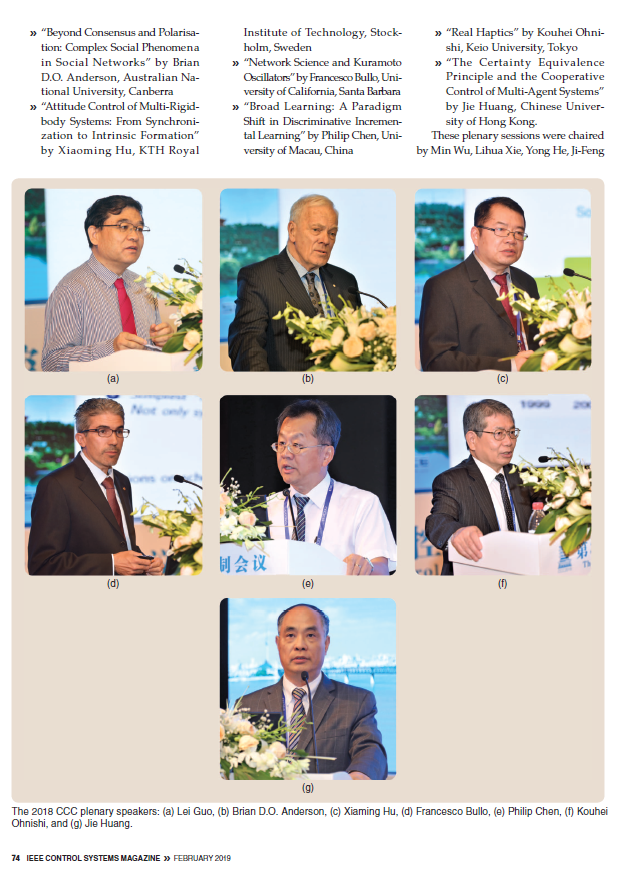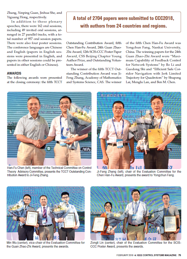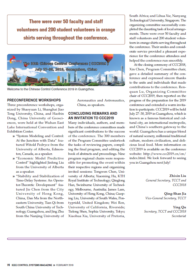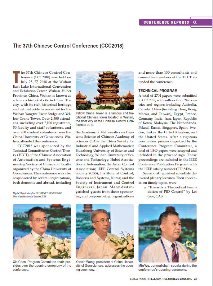 2018年7月25日至27日,由韦德博彩官网 承办的第37届中国控制会议(CCC2018)获得圆满成功。本次会议受到国际学界关注,国际知名期刊《IEEE Control Systems Magazine》对会议作了大篇幅报道。
