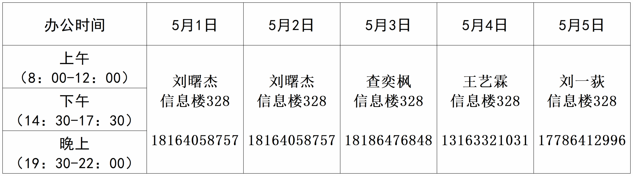 5.放假期间,学院严格执行值班制度,安排辅导员值班,值班信息张贴于信息楼328,确保通讯畅通、应急反应迅速。如遇突发情况,请及时联系学院老师或学校有关部门。