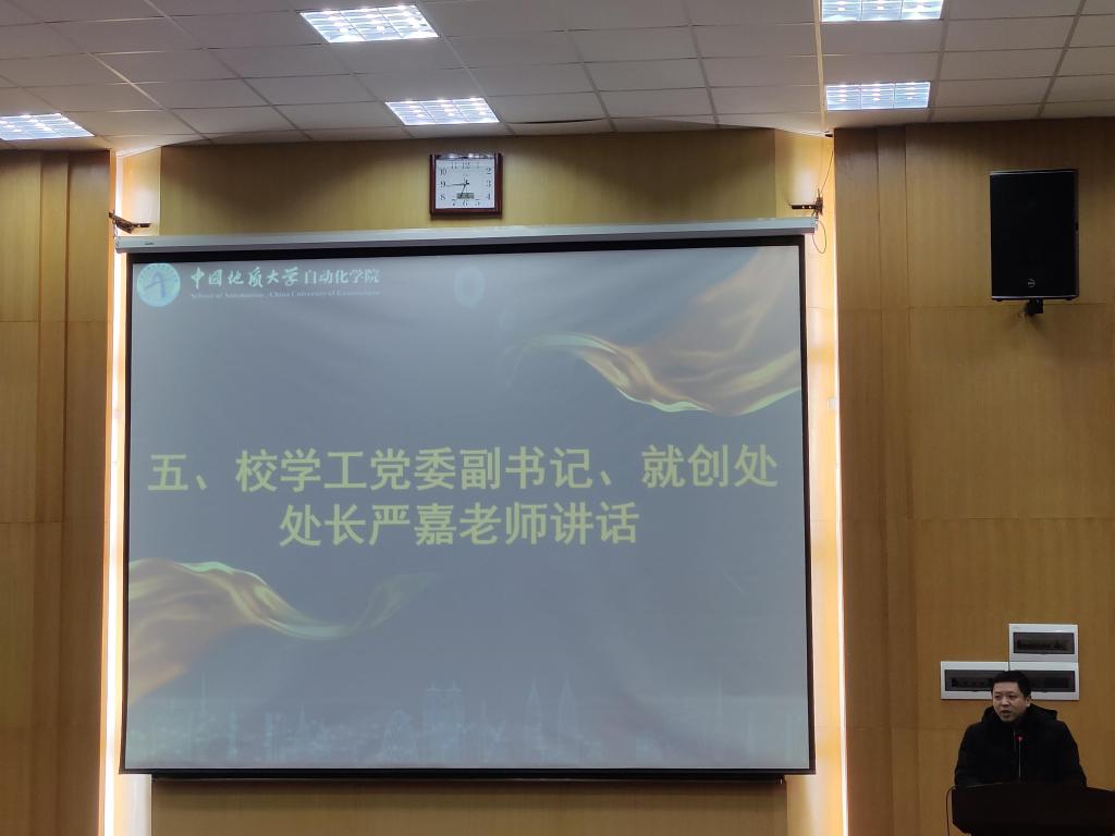 大会第四项,校学工党委副书记、就创处处长严嘉老师讲话。严老师首先代表学校党委对首届 “走进自动化”系列活动的成绩表示了肯定与赞扬,对在本次活动中积极参与的学生表达了祝贺与感谢。随后,严嘉老师结合现在国际大背景环境下提出当代青年的责任与担当,唯有加强技术研发以巩固以进一步提高我们国家的科技实力。他希望通过“走进自动化”活动可以将一二课堂交叉融合,同时,同学们积极参与专业实践活动,将个人所得与国家需要、国家战略结合。