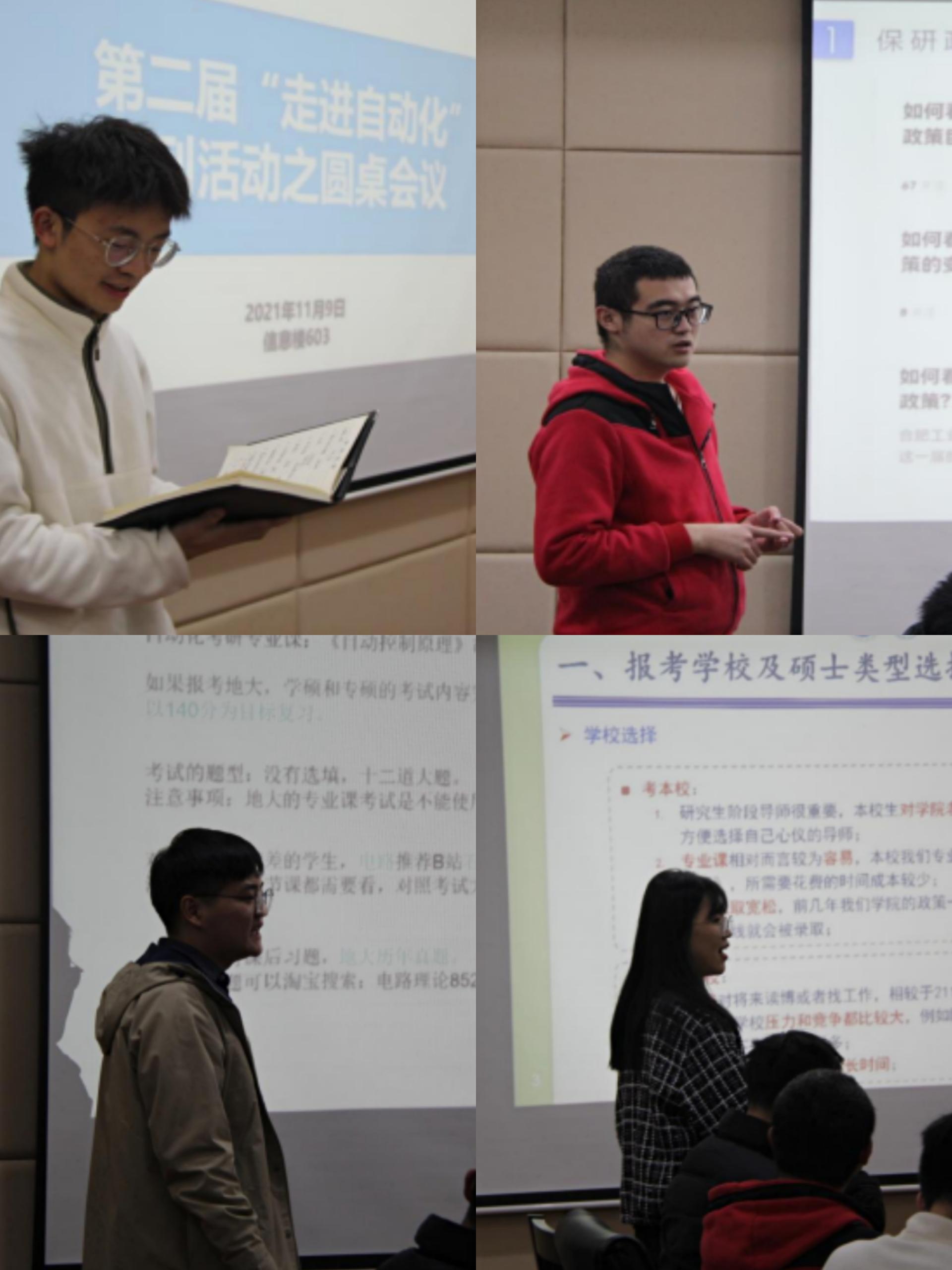 第二届“走进自动化”系列活动之朋辈引领学习会之圆桌会议——“探寻心中热爱,规划未来蓝图”主题班会在信息楼603举行。本次交流会邀请到了辛浩男、廖宇航、闫晴晴、喻学孚四位高年级同学来做分享,本次活动由231192班长张宇一同学主持,班主任魏龙生老师参加。本次活动旨在促进班级凝聚力,帮助高年级同学进行未来选择的规划,对专业前景、就业方向有一个清晰地认知,并通过这样小范围的深入交流更加具有针对性的为同学们答疑解惑。