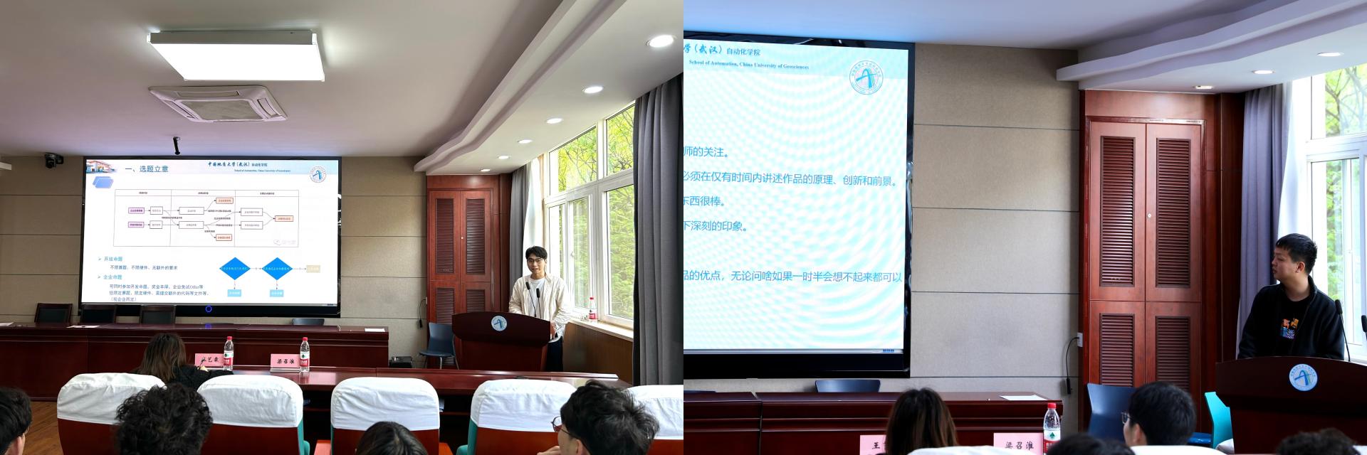 “王乐斋队”队长张阳政以去年的全国总决赛的PPT为例,展示了PPT各个部分的细节与内容,他强调技术论文的结构与逻辑要严谨,内容要详实,同时要注意书写格式的规范,PPT展示时条理清晰,图文并茂,答辩环节要提前准备问题库,尽可能充分展示作品的优点。