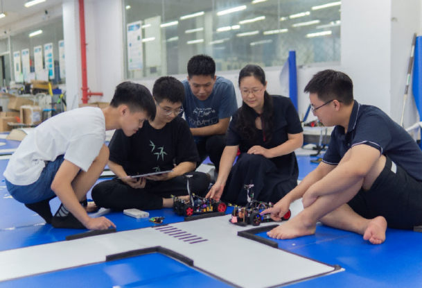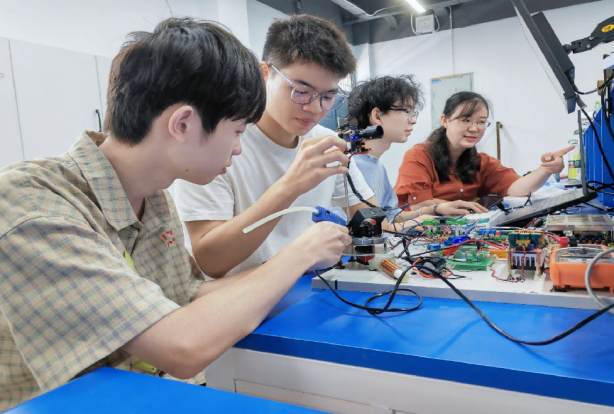 基地位于南望山校区的教三楼五楼、六楼以及未来城校区的四楼和五楼,总面积超过1000平方米,共有14个实验室。这些实验室装备了丰富先进的实验设备,包括示波器、信号源、稳压电源、万用表、扫频仪和Q表等,设备台套数已经超过200,为学生提供了宽敞、良好的实践场所和充足的实践资源。不同实验室内部设有不同组别的智能车专用赛道、无人机赛道和四足仿生机器人竞技赛道等,不仅为学生提供了更多元化的实践平台,也极大地激发了他们的实践热情和创新精神。同时,基地设置了讨论区、休息区等功能区域,方便学生进行学术交流和休息。