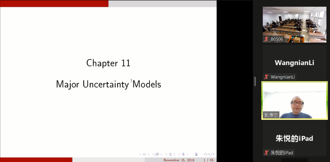刘康志教授讲授内容涵盖了鲁棒控制的工程背景、常用工具、经典方法、研究前沿等。Fundamentals of Robust Control Theory (1): Backgrounds and Basic Tools主要讲述了工程背景、目前主流方法以及线性代数基础知识;(2) Uncertainty Models主要讲述在鲁棒控制中如何利用不确定性特性以及利用带有自由参数的简单公式来描述稳定判据; (3) Tools for robust analysis and design主要讲述时域与频域性质之间的关系以及基本的控制设计方法; (4) Typical Methods of robust analysis主要讲述增益有界不确定性系统的鲁棒性条件; (5) Typical Methods of robust analysis主要讲述李亚普诺夫和无源性两种经典鲁棒控制方法; (6) Lur’e system and new directions主要讲述Lur’e系统并介绍了鲁棒控制新的方向和实际应用。刘康志教授认真负责,授课严谨细致,从控制科学的角度出发,为学生深入讲解了控制领域鲁棒控制的应用,并在课后留出时间为研究生答疑解惑,学生们收获颇丰。